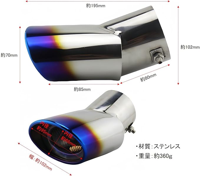 汎用マフラーカッター。下向きマフラー用。材質:ステンレス。サイズ:約(L)195mm (W)102mm (H)102mm。重量:約360g。