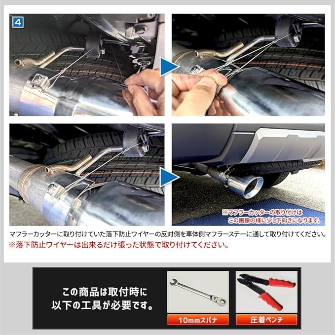 【工具があれば簡単取り付け、加工不要】 10mmスパナと圧着ペンチがあれば、ボルト3本で純正マフラーに装着するだけ。特別な加工は一切不要で、DIY初心者でも安心して取り付けられます。