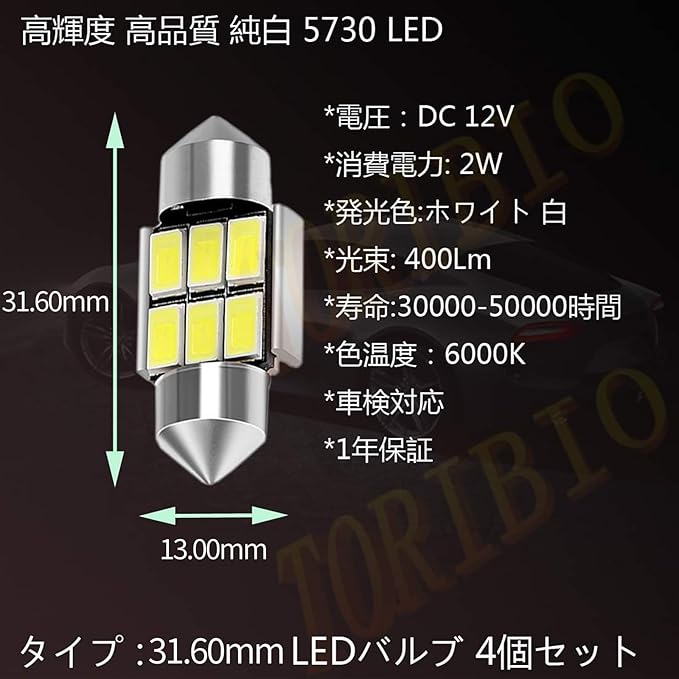 【T10 LED 】 T10 31.6mm ルームランプ LEDチップ: 5730LED 6連 DC12V車用 セット数:4個,パッケージ:帯電防止袋 【メーカー保証】ブランド名:TORIBIO(登録第6135494号) *:製品の長さは 31.6 mmですので、誤って購入しないようご注意ください!