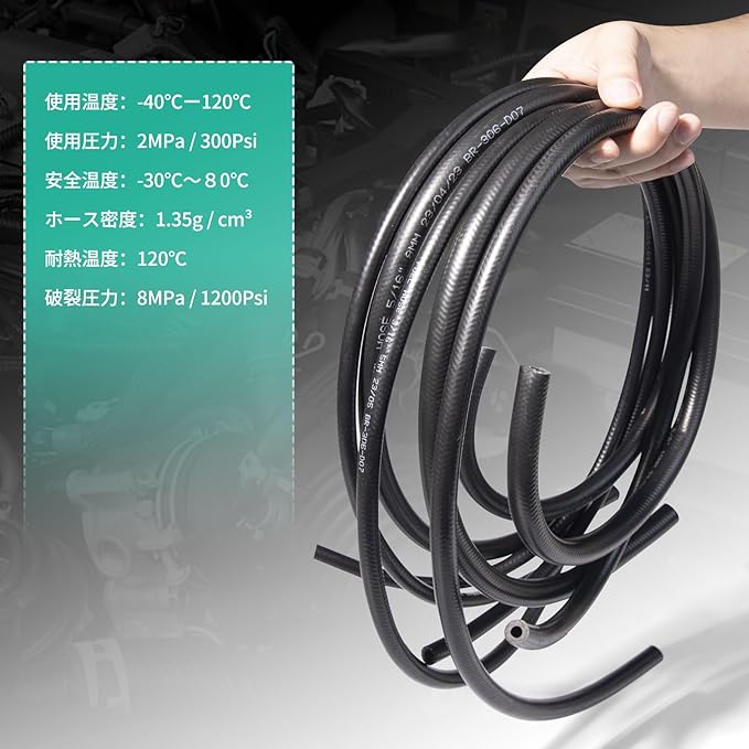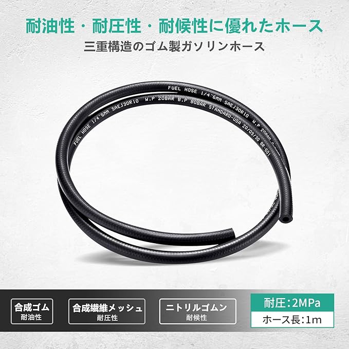 【製品仕様】✦製品名:内径6mm燃料ホース;✦モデル:三重構造;✦サイズ:内径6mm 外径12mm、全長1m;✦作業圧力:300psi(20.6bar)、破裂圧力:1200psi(82.7bar);✦耐熱限界温度:120℃、使用安全温度:-30℃~80℃。