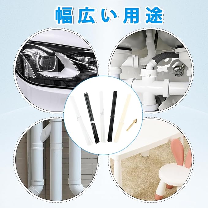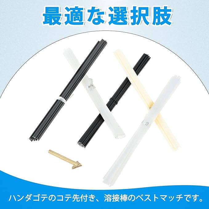 【セット内容】プラスチック溶接棒*50本(PP白*10本、PP黒*10本、ABS*10本、PE*10本、PVC*10本)、長さが約20cmです。三角形溶接頭*1です。