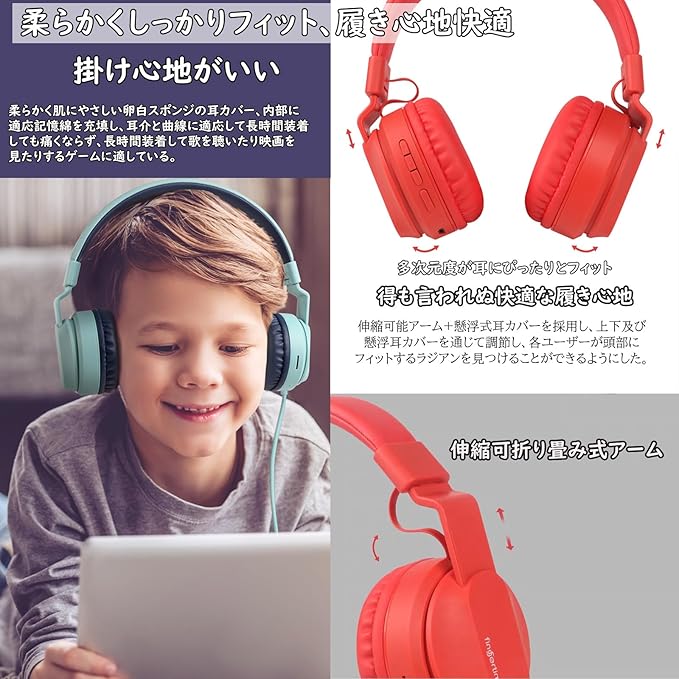 【掛け心地がいい&折りたたみ設計】多次元度が耳にぴったりとフィットして妙な快適な装着感をもたらします。伸縮可能アーム+悬浮式耳カバーを採用し、上下及び悬浮耳カバーを通じて調節し、各ユーザーが頭部にフィットするラジアンを見つけることができるようにした。柔らかく肌にやさしい卵白スポンジの耳カバー、内部に適応記憶綿を充填し、耳介と曲線に適応して長時間装着しても痛くならず、長時間装着して歌を聴いたり映画を見たりするゲームに適している。6000+次延伸破壊試験を経て、耐久性がある。この子供用イヤホンは折りたたみ式でコンパクトで軽量で持ち運びや保管に便利です。
