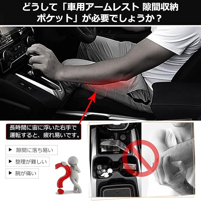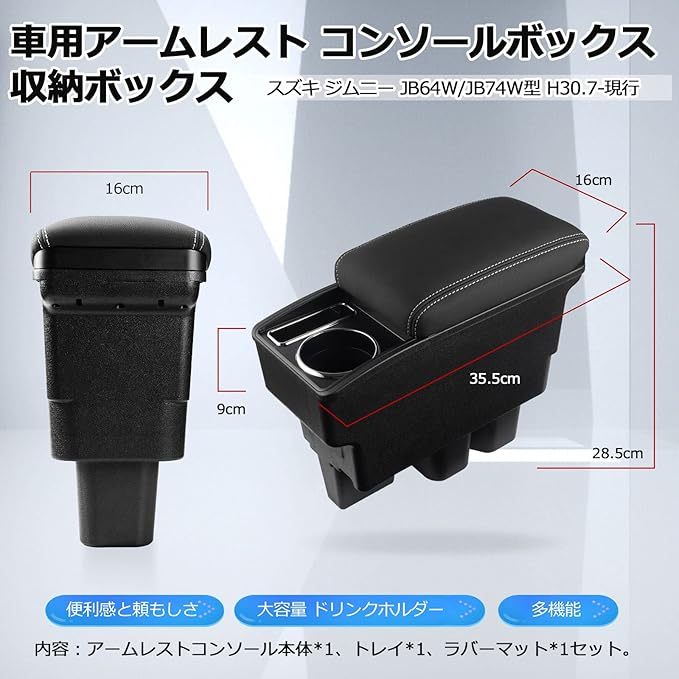 4.【ジムニー収納には最適】:ジムニー専用アームレスト*1、内部トレイ*1、マット*3。肘掛けとしてだけではなく、傘や水、コインや鍵などを入れる大容量収納ケースとして使え、車内をキレイに!さらに、実用性と快適性を両立させており、お手軽いに想像以上のドレスアップ効果をもたらします。