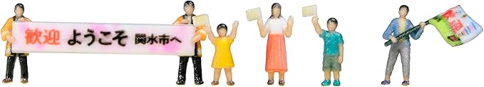 観光列車や記念列車に向かって旗を振り、横断幕を掲げてお出迎え・お見送りする姿を再現した1/150スケールの人形が登場。観光列車のお出迎えやお見送りのワンシーンで見られる、旗や横断幕を掲げて歓迎する様子を演出し、ジオラマにストーリーをプラスするアイテムです。
