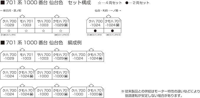 各セットともモーター車を含み、2両・4両単独編成のほか、2+2、2+2+2、2+4など、多彩な組み合わせをお楽しみいただけます。