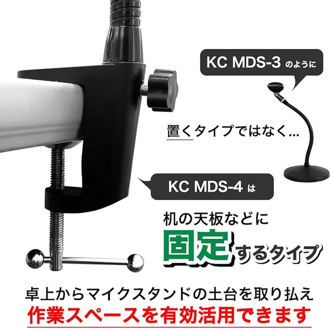 KCマイクスタンドの“MDS-4"は「置くタイプ」ではなく、机の天板などに「固定するタイプ」のグースネックタイプマイクスタンドです。