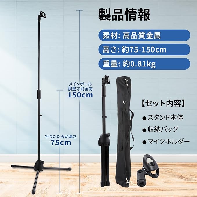 【高さ調整が自在で使いやすい】 使用シーンに応じて高さ調節が簡単に可能。ライブやコンサート、発表会など、立ち位置や演出に合わせて、75cmから150cmまで、最適な高さに調整できます。スタジオや会議室でも快適に使えます。