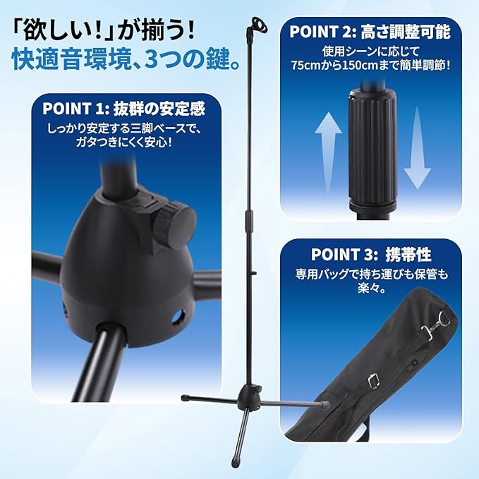 マイクスタンド ストレート 収納バッグ付き 高さ 調整 可能 三脚ベース スタンドマイク 有線マイク カラオケ ライブ 発表会 会議 講習会
