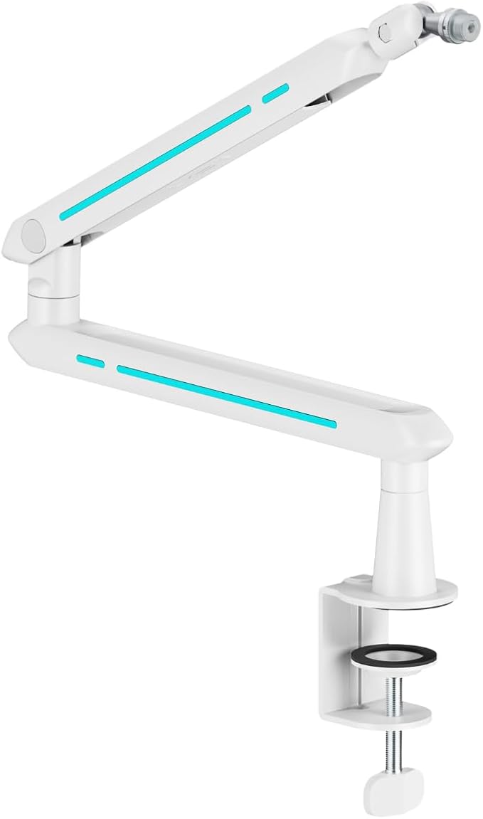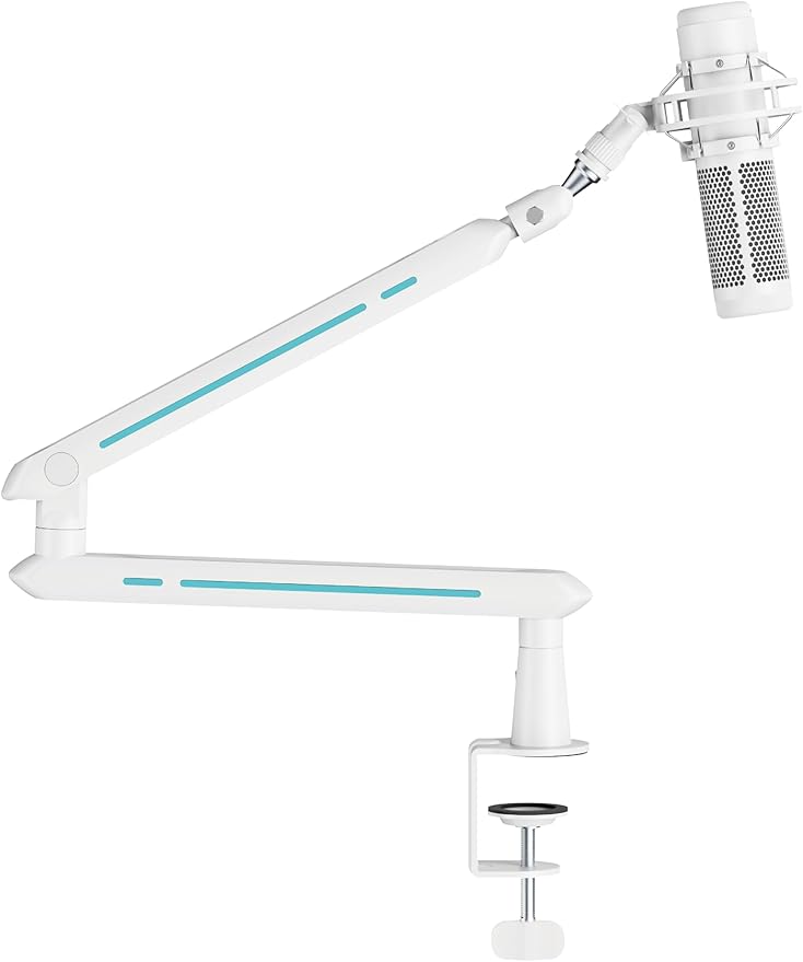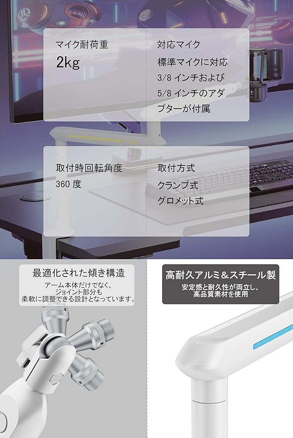 簡単な取り付け::クランプ式でデスクにしっかりと固定できるため、設置や取り外しが簡単で、場所も取りません。これにより、安定性を保ちながらマイクを使用できます。