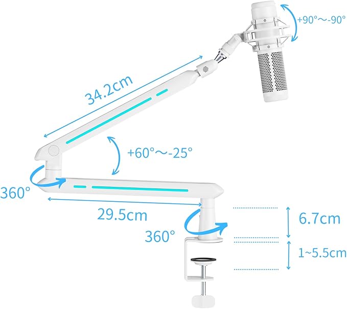 360度のフル回転アーム: マイクアームは360度回転可能で、あらゆる角度に調整できます。これにより、収録時や配信中にマイクを素早く適切な位置に移動させることが可能です。多様な配置や作業シーンに対応でき、使い勝手が非常に良好です。