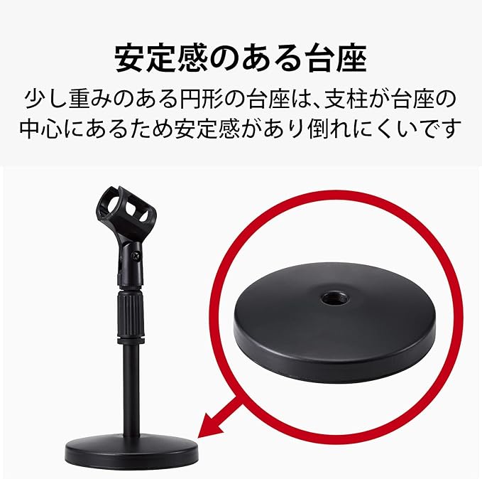 ■動画撮影をランクアップする卓上型マイクスタンドです。 ■伸縮する支柱にマイクを装着して、お好みの高さに調節できます。 ■アジャスターで高さ調節がラクラク可能です。 ■ホルダー部は角度調節可能なため、お好みの角度で使用可能です。 ■少し重みのある円形の台座は、支柱が台座の中心にあるため安定感があり倒れにくいです。 ■直径約25~30mmのマイク(マイクグリップ中央付近の直径)に対応しています。