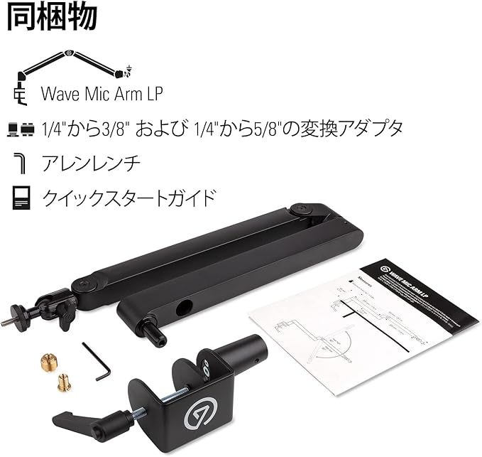 最高級マイクのためのスタジオ仕様ブームアーム、Wave Mic Arm LPは肩のラインより下に収まるので、視界を遮ることがありません。水平方向に360 、垂直方向に90 回転できるので、さまざまな角度に自由自在に調整できます。磁気式カバーが付いた付属のケーブルレールがセットアップをすっきりと見せます。また、ネジ変換アダプタで主流なマイクマウントに対応します。 同梱物 Wave Mic Arm LP 1/4"から3/8" および 1/4"から5/8"の変換アダプタ アレンレンチ クイックスタートガイド 技術仕様 全長 (水平時):740 mm / 29.1 in 下アームとデスク面の間隔:70 mm / 2.8 in 上アームからデスク面の間隔: 160 mm / 6.3 in 水平回転:360 (ベースと関節) 垂直回転:90 (上向き)/ 60 (下向き) デスク用クランプ:最大開口幅 60 mm / 2.4 in 最大耐荷重:2 kg / 4.4 lbs (マイクとアクセサリを含む)