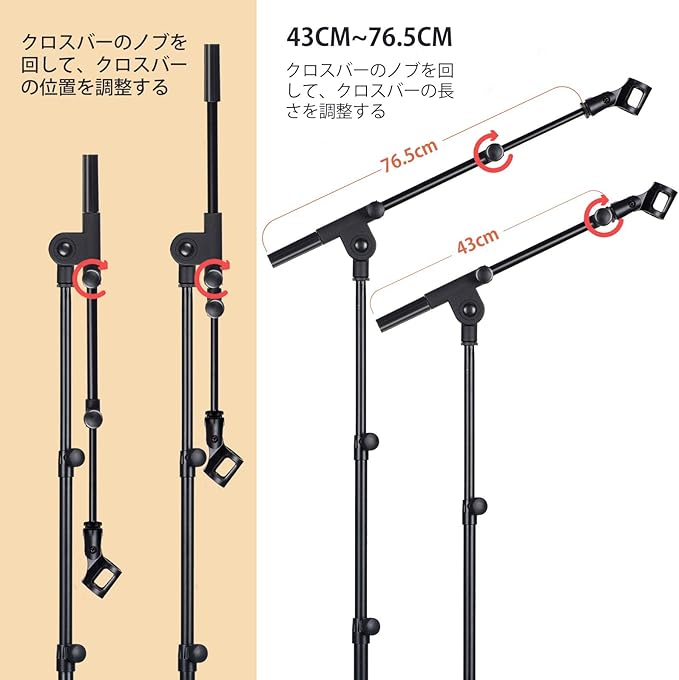 【伸縮&着脱式ブームアーム】ブームアームは約43~76cmまで伸縮可能。角度は360 自由に調整でき、細かなポジション設定が簡単です。取り外せば、ストレートタイプのマイクスタンドとしても使用できます。