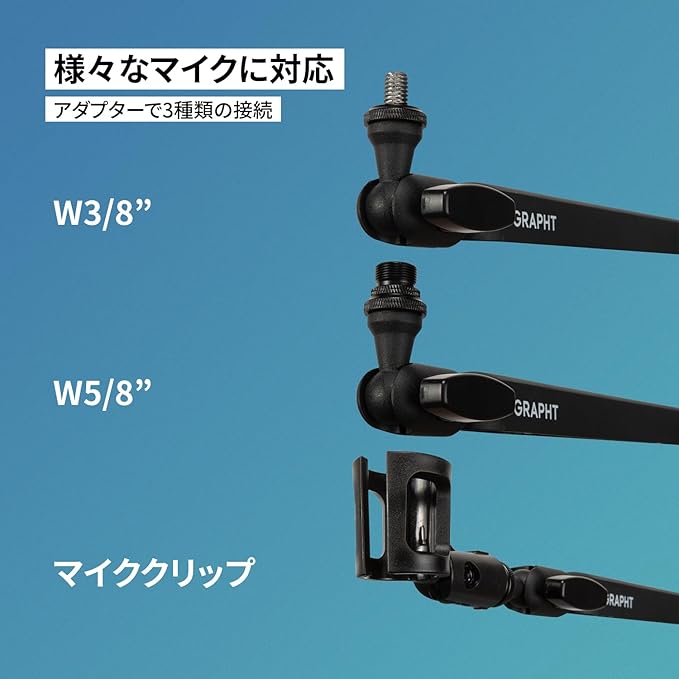 ✅【様々なマイクに対応】 W3/8”、W5/8”、マイククリップの3種に対応。 アダプターを付け替えるだけで、様々なマイクを簡単に取り付け可能です。 ※最大装着重量:2kg
