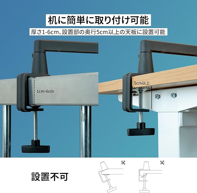 ✅【机に簡単に取り付け可能】Cクランプ、ブームアームの各所に取り付けネジ、つまみネジがついており、工具を使用せずに組み立てや調整をすることが可能です。※厚さ1-6cm 奥行5cm以上の天板に対応