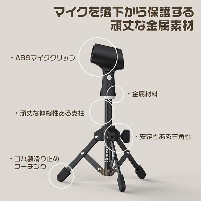 三脚&ノンスリップベース:Getariaの三脚卓上マイクスタンドは、鉄の材料で構成されており、硬くて丈夫と耐久性。三脚の設計によってそれはテーブルの上で安定できます外力の行為の下で容易に、転がらない。調節可能で折りたたみ式なので、さまざまな位置にスタンドを配置することができます。