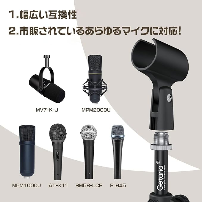 様々なマイクに対応:ATR2100-USB、AT2005-USB、Samson Q2U、Behringer Xm8500、SM58-LC PGA48/PGA58などのダイナミックマイクロフォンに対応しています。3本の脚のうち1本がマイクの前にあることを確認してください、そうでない場合は転倒します。それは5.5ポンドの最大重量をサポートし、安定したマイクの配置のバランスをとる。
