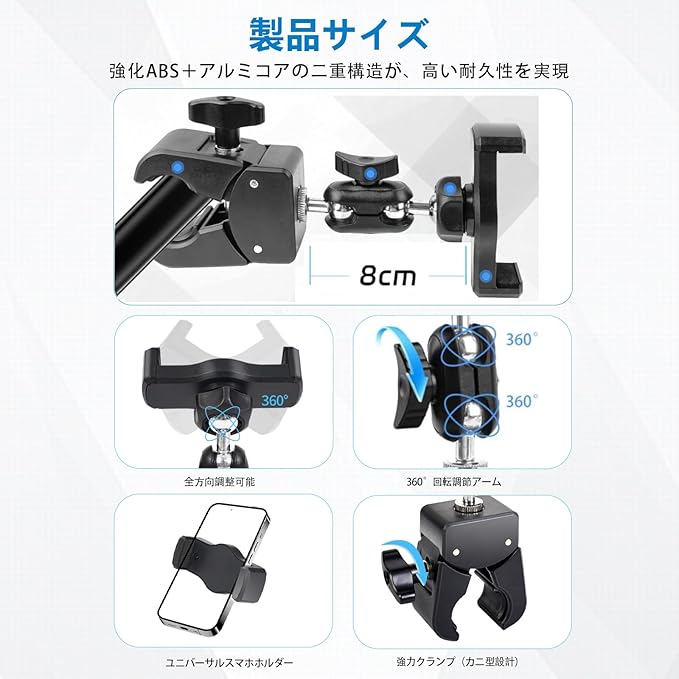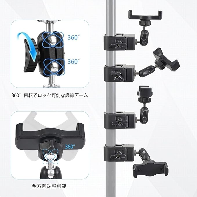 360 ロック可能な調節:ダブルボールジョイントで360 全方向調整。縦横画面切替えと角度調整が自由にでき、素早くロック。重量バランス設計で揺れなく、常に安定した撮影を実現。