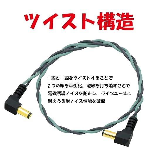 +線と-線をツイストすることで2つの線を平衡化、磁界を打ち消すことで電磁誘導ノイズを防止し、ライブユースに耐えうる耐ノイズ性能を確保。また、電源線とグラウンド線は同一ケーブルを使用し、グラウンドに流れるリターン電流を考慮することでクリアな音質と音抜けを実現しました