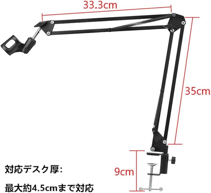 「商品仕様」:素材:金属 + absプラスチック。対応デスク厚:最大約4.5cmまで対応。対応マイクサイズ:直径約26~45mmのマイクに対応