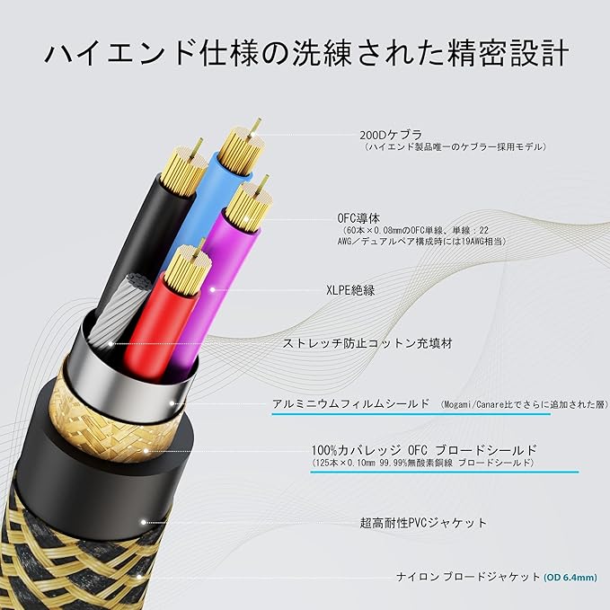【ケブラー補強による耐久性向上】AA のハイエンドケーブルは内部にケブラー繊維を統合。引張強度と耐伸張性が大幅に向上し、頻繁な使用や屈曲にも強く、長期的なオーディオ性能の安定を保ちます。