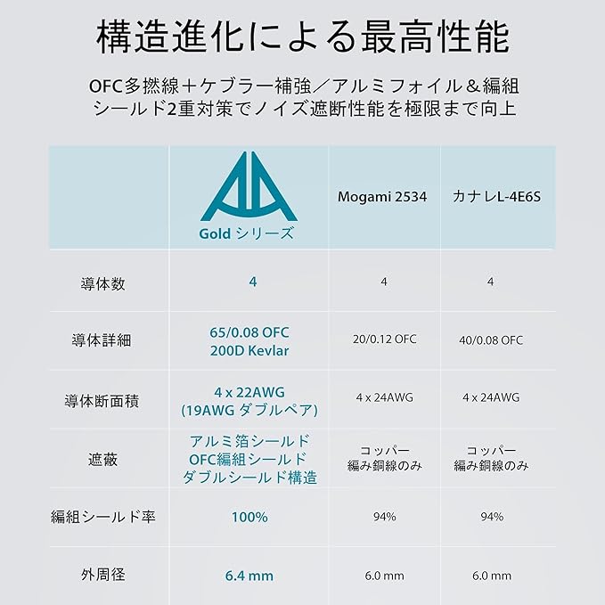 【ノイズゼロの 2 層シールド設計】AA Gold シリーズ XLR ケーブルは、100% 無酸素銅(OFC)編組シールドとアルミホイルシールドの 2 層構造を採用。これにより、RF(高周波)・静電気・EMI(電磁妨害)などの外部干渉を効果的に遮断し、ノイズの混入を限りなくゼロに抑えます。