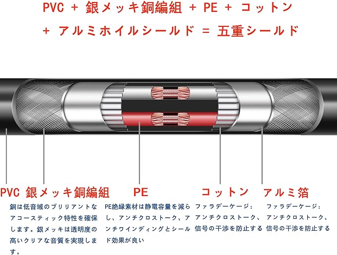 4重シールド(118編組 銅+アルミ箔シールド+PE+綿):電磁干渉防止、RF、WIFI、AM、静電気放電、静電気防止、接地に適しています。干渉防止回路:ファラデーケージ、ノイズキャンセリング。この3.5 xlrマイクケーブルはポリエチレンPE絶縁素材付くから、環境保護、耐食性、熱特性、紫外線と湿気に耐えられます