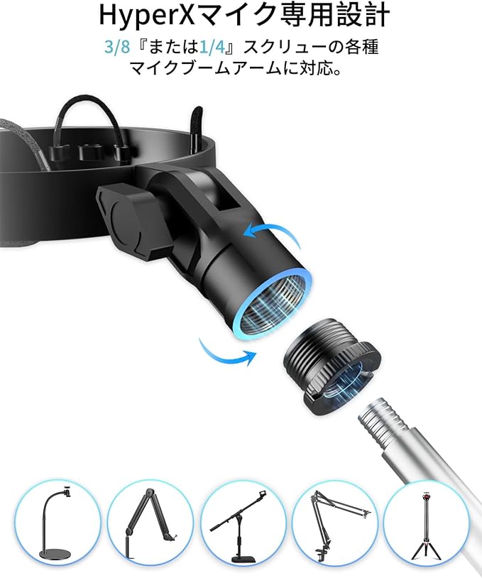HyperX Quadcast対応 マイクショックマウント ポップガード付き 振動防止 1/4 & 3/8ネジアダプタ付きメーカー2年保証 ブラック