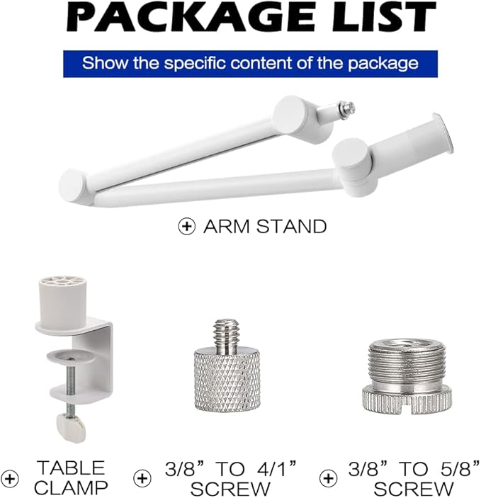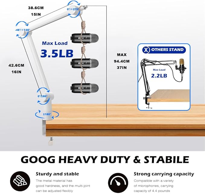 頑丈なマイクスタンド - 強力なスチール製で、ダブルサポートアームがより多くの重量に耐えて強度を高め、超強力なスプリングによりマイクが誤って落下したり、ノイズや揺れが発生したりするのを防ぎ、最大3.5ポンドまで耐えることができます。 強力なCクランプを採用しており、机の端に固定でき、使用中に動いたりずれたりすることはありません。