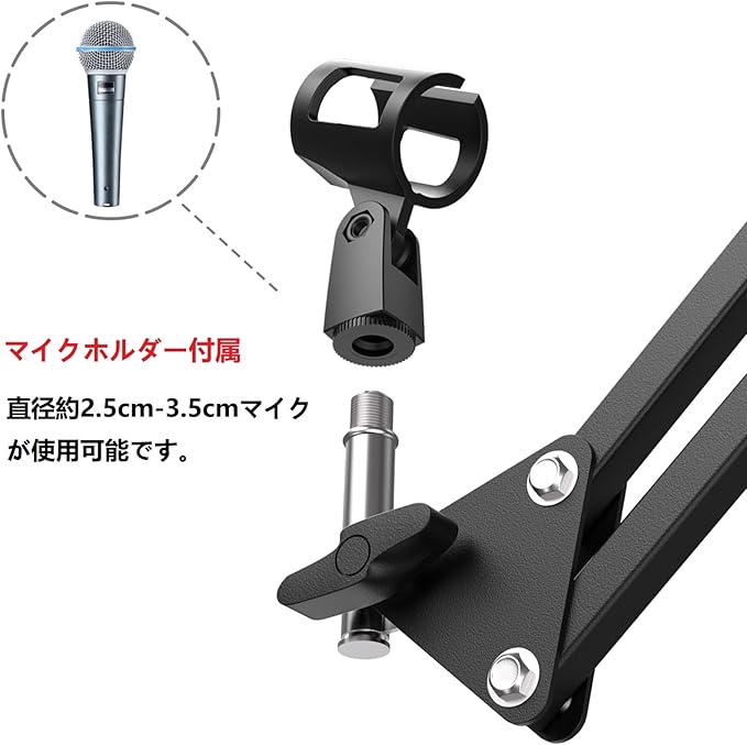 商品仕様:対応デスク厚:最大約5cmまで対応、マイクの内径:2.7cm、対応マイクサイズ:直径約2.5cm~3.5cmのマイクに対応できる