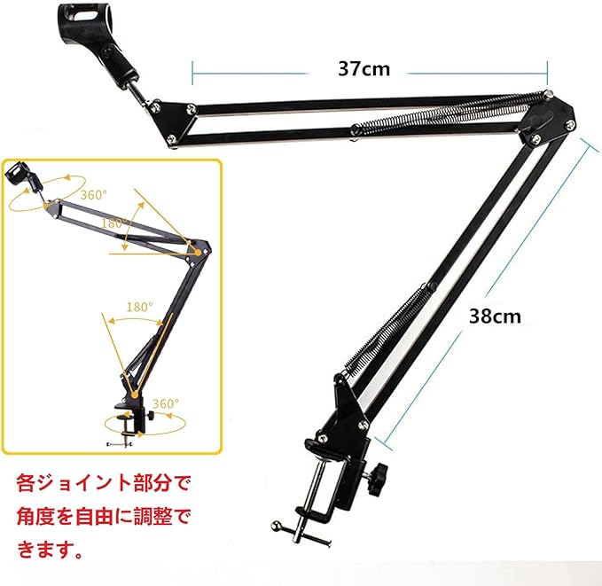 360 回転・角度調節:根元は360度回転し、各ジョイント部分で角度を自由に調整できます。マイクを最適な位置にぴったりとセットでき、収録や配信、カラオケなどで自分の好みに合わせて調整可能です。