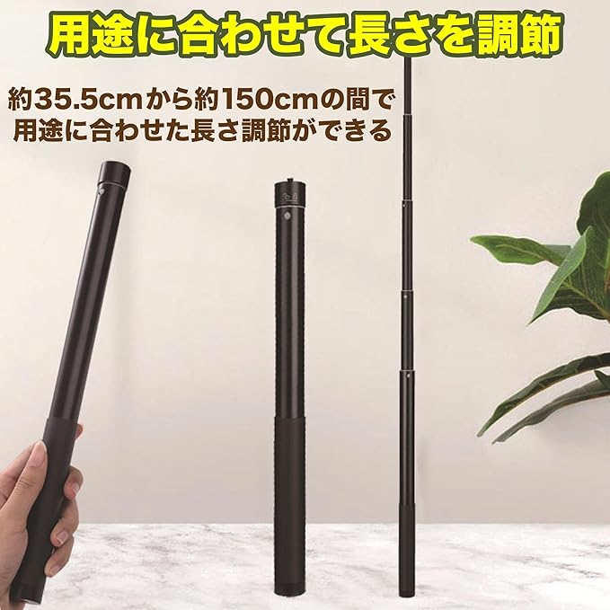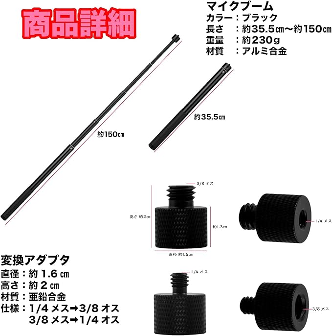 収縮時の長さ:約35.5cm 最長時の長さ:約150cm 重量:約230g ポールの耐荷重:約2kg 材質:アルミ合金 カラー:ブラック 付属品:変換アダプタA(直径:約1.6cm 高さ:約2cm 材質:亜鉛合金 仕様:1/4メスから3/8オスに変換)、変換アダプタB(直径:約1.6cm 高さ:約2cm 材質:亜鉛合金 仕様:3/8メスから1/4オスに変換)