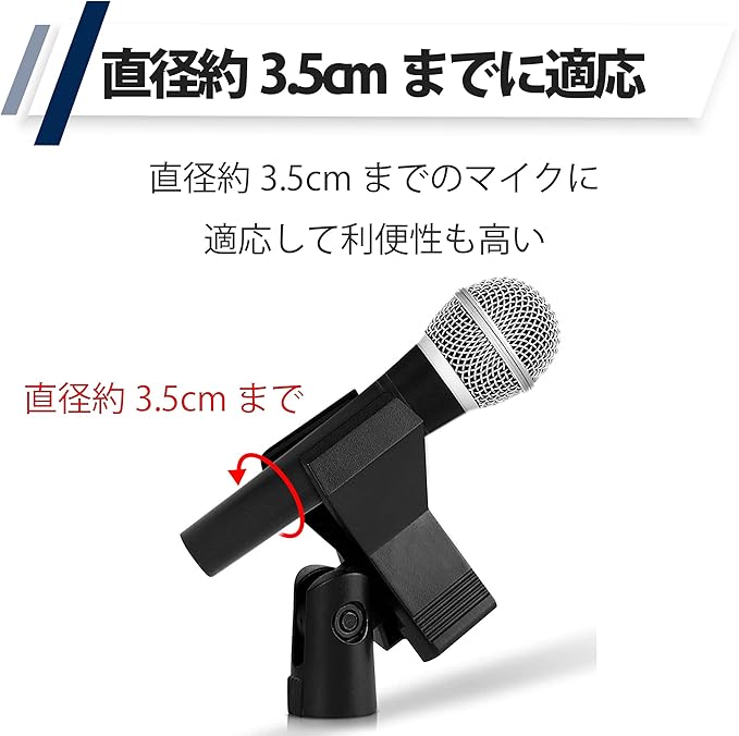 直径約3.5cmまでのマイクに適応:こちらのマイクホルダークリップは、直径約3.5cmまでのマイクに適応しています。適応範囲が幅広いので、利便性も高いです。