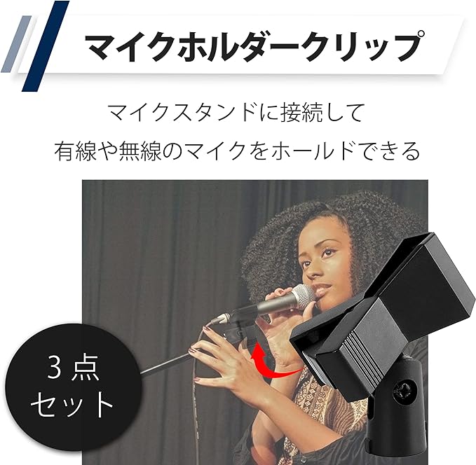 マイクスタンド用マイクホルダークリップ:マイクスタンドに接続して有線マイクや無線マイクをしっかりホールドすることができる、クリップ式のマイクホルダー3点セットです。クリップ式なので、素早くマイクをホールドできます。