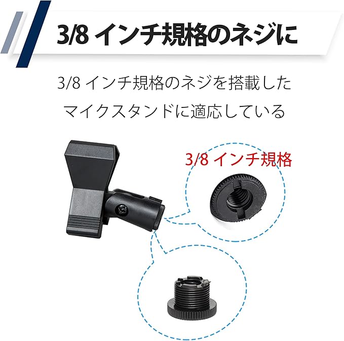 3/8インチ規格のネジに適応:こちらのマイクホルダークリップは、3/8インチ規格のネジを搭載したマイクスタンドに適応しています。有線マイクとワイヤレスマイクの両方に適応しています。