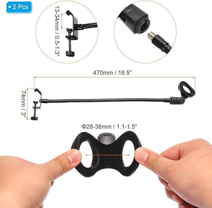 仕様: 全体サイズ: 470 x 74 mm (長さ*幅); チューブ外径: 10mm ; 雄ねじサイズ: 3/8"; マイクホルダー直径: 28mm~38mm; マイク クリップサイズ: 12mm~34mm; 材質: 金属; カラー: 黒; 梱包内容: グースネックチューブ x 2; クリップ x 2; マイクホルダー x 2; 3/8"~5/8"マイクアダプター x 2。