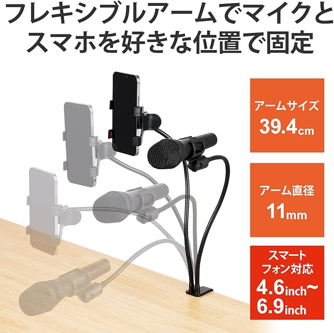 ■これひとつでスマホもマイクも固定できる、スマホホルダー付きグースネック型マイクスタンドです。