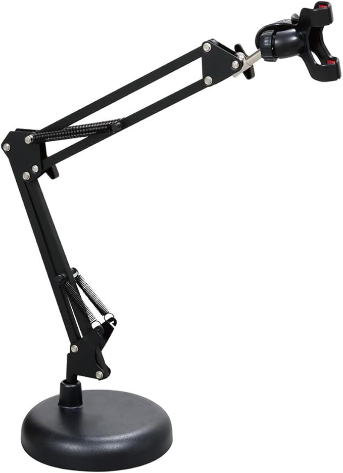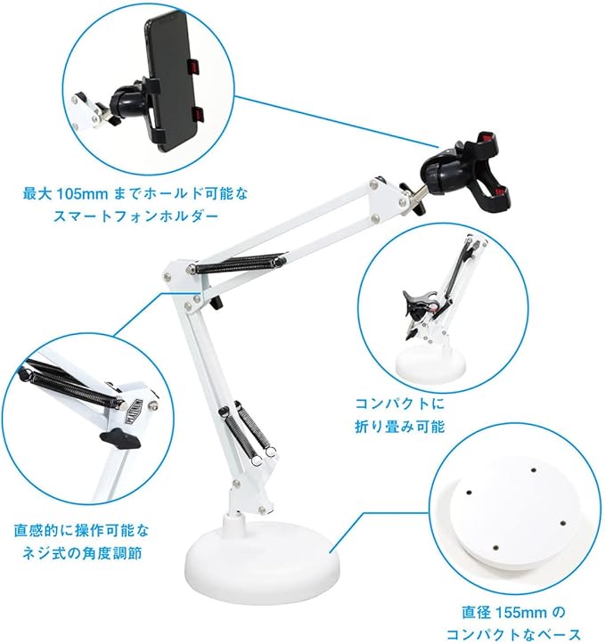 スプリングアームの卓上スマホスタンドです。自在に位置の調節が可能で、動画視聴はもちろん、キッチンでレシピを見ながら料理をする際、さらには真上からのアングルで両手で作業する、料理動画やソーイング動画を撮影する際などに活躍します。ベースは直径157mmで、作業の邪魔になりにくいコンパクトな仕様です。使わない際は折り畳んで収納可能。スプリングアームはジョイントのネジを緩めてもバランスを維持するので調節がしやすく、丈夫なのも特徴です。