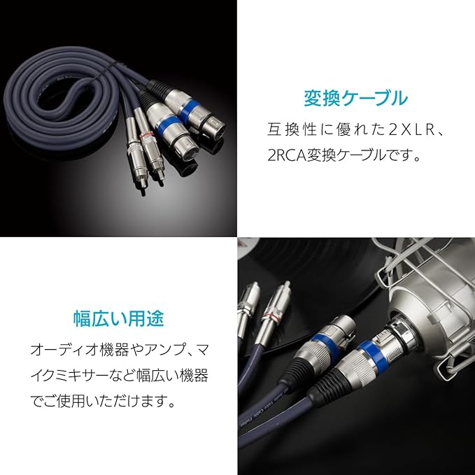互換性に優れた2XLR、2RCA変換ケーブルです。オーディオ機器やアンプ、マイクミキサーなど幅広い機器でご使用いただけます。