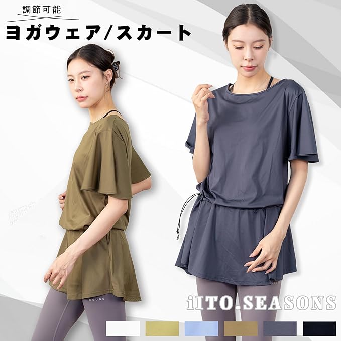 [iito.seasons] ヨガウェア 背中開き スカート トップス 丈長め ゆったり フィットネスウェア 体型カバー めくれない ロング丈 冷感シャツ 薄手 吸汗 速乾 UVカット 紫外線対策 おしゃれ 人気