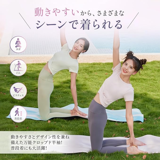 [Yomoment] ねじりデザイン ヨガウェア トップス レディース 半袖 クルーネック ショート丈 カップなし 吸汗速乾 ストレッチ 快適 動きやすい 無地 Tシャツ トレーニング フィットネス ピラティス スポーツ 通気性 伸縮性 おしゃれ | funshop