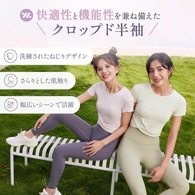 [Yomoment] ねじりデザイン ヨガウェア トップス レディース 半袖 クルーネック ショート丈 カップなし 吸汗速乾 ストレッチ 快適 動きやすい 無地 Tシャツ トレーニング フィットネス ピラティス スポーツ 通気性 伸縮性 おしゃれ
