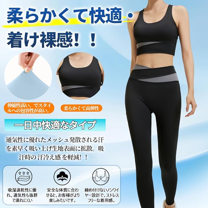 [FLYSHION] スポーツブラ レディース 揺れない ブラジャー スポーツブラジャー しっかりサポート ヨガブラ トレーニング レディース 伸張 おしゃれ 完璧な形状 快適な動き 2枚組 上下セット