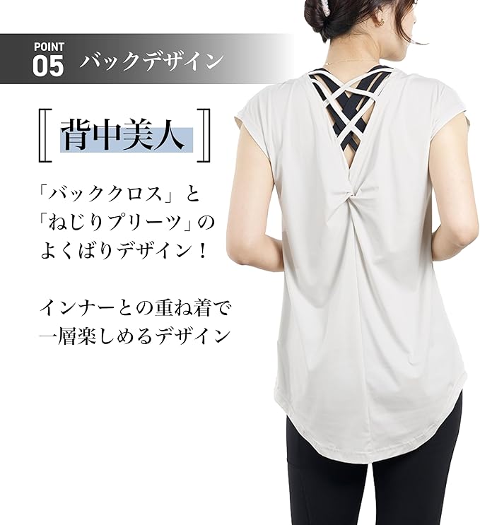 [iito.seasons] ヨガウェア レディース トップス バックデザイン 美背中 ロング丈 丈長 体型カバー Tシャツ クルーネック 半袖 ゆったり 体型カバー 冷感シャツ 無地 女性らしい スポーツ フィットネス トレーニング ルームウェア おしゃれ | funshop