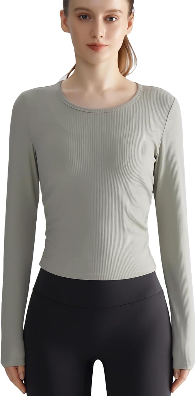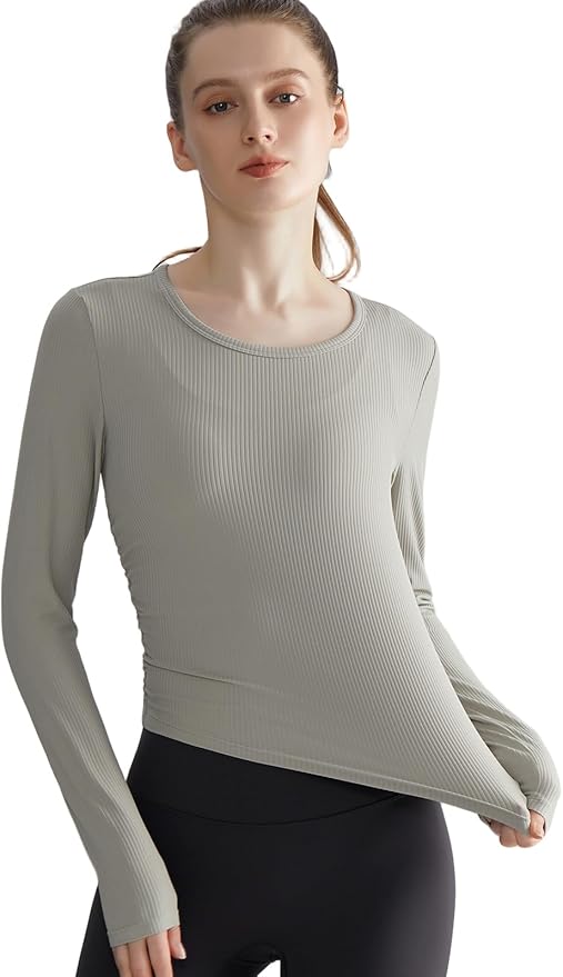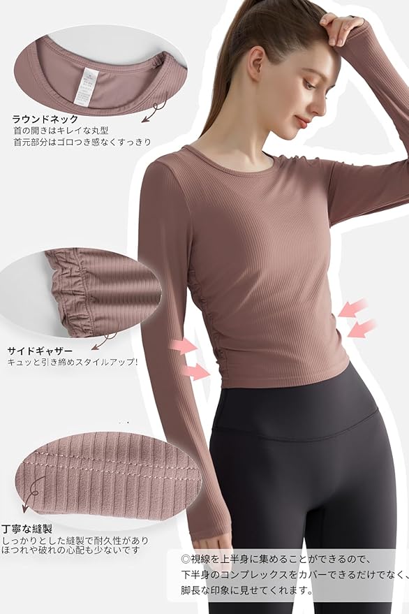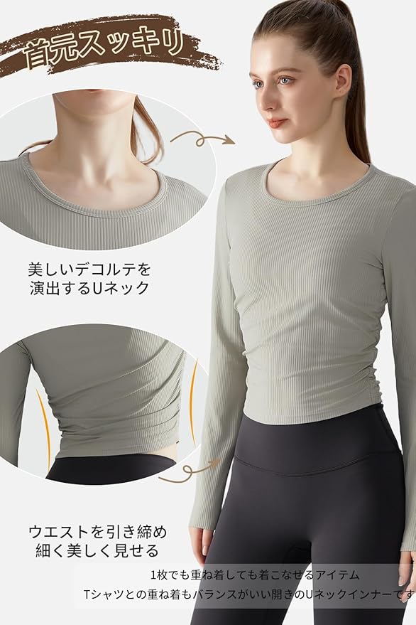 [MORGEN SKY] ヨガウェア レディース 長袖 Tシャツ トップス Uネック サイドギャザー インナー スポーツウェア フィットネス トレーニング 吸汗 速乾 通気 無地 おしゃれ ロングスリーブ プルオーバー CX15