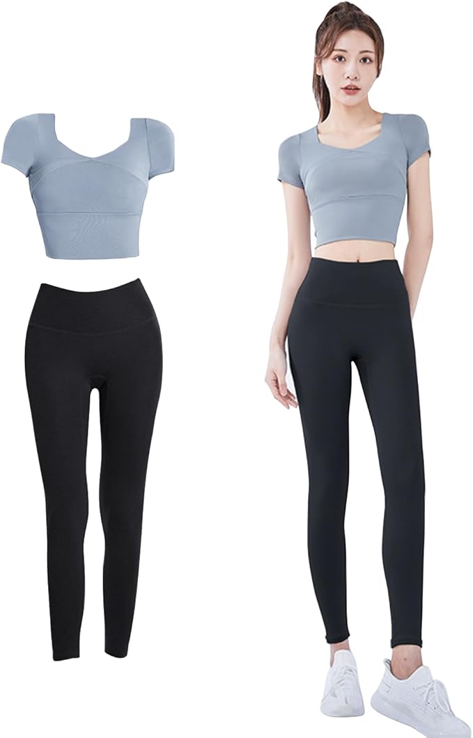 [Nippaws] ヨガウェア レディース スポーツウェア【ハイウエスト・吸汗速乾・通気性・伸縮性】 揺れない ブラジャー しっかりサポート ヨガブラ トレーニング 2枚組 上下セット