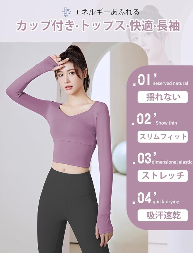 [Karsaer] ヨガウェア トップス 長袖 レディース スポーツブラ 長袖 体形カバー スリムフィット トレーニングウェア カップ付き ヨガ 吸汗速乾 通気性 ジム/ランニングA0023