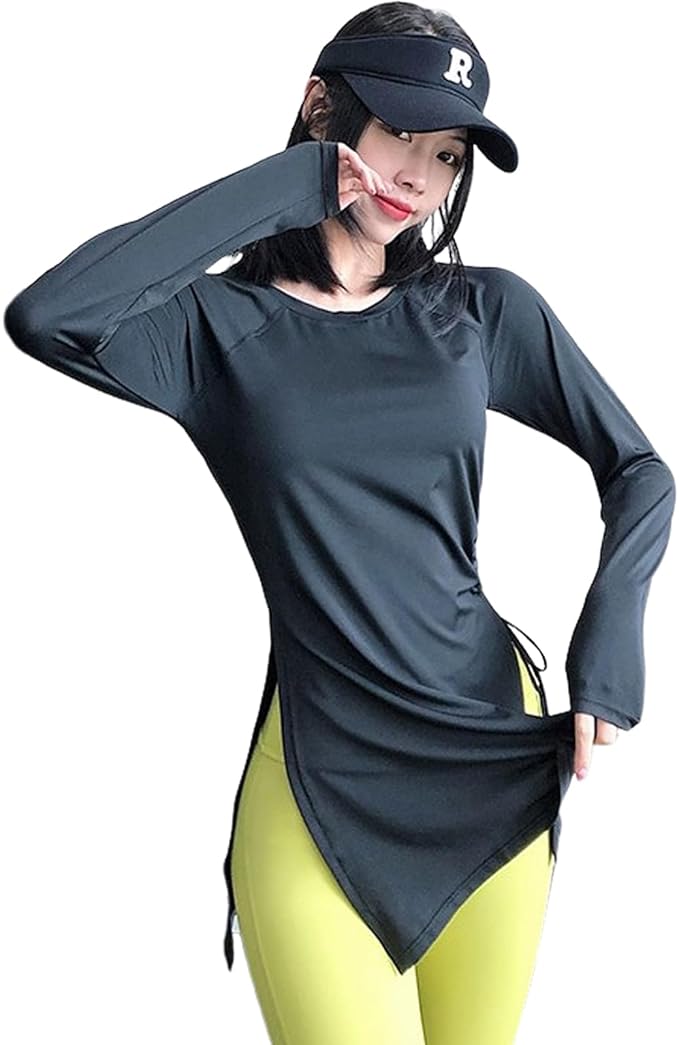[Karsaer]ヨガウェア レディース 長袖 スポーツトップ ブラウス ラグランスリーブ スリット入り クルーネック ドローストリング 美腰効果 中強度運動対応 ロングトップ お尻まで隠れる丈 ゆったり スリムフィット 美ウエスト サイドスリット トップス ストレッチ 吸湿速乾 通気 ピラティス 美シェイプ 丈長め 体型カバー ジムウェア ランニング 可愛い スポーツウェアA0032