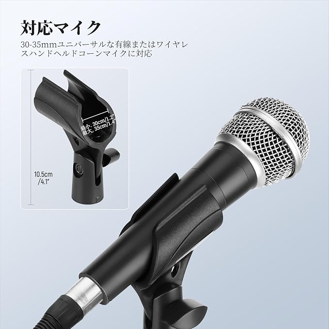 【幅広い互換性】マイククランプには、3/8" to 5/8"ネジアダプターが2つ付属しており、30mm-35mmまで汎用な有線または無線ハンドヘルドコーン型マイクに対応します。