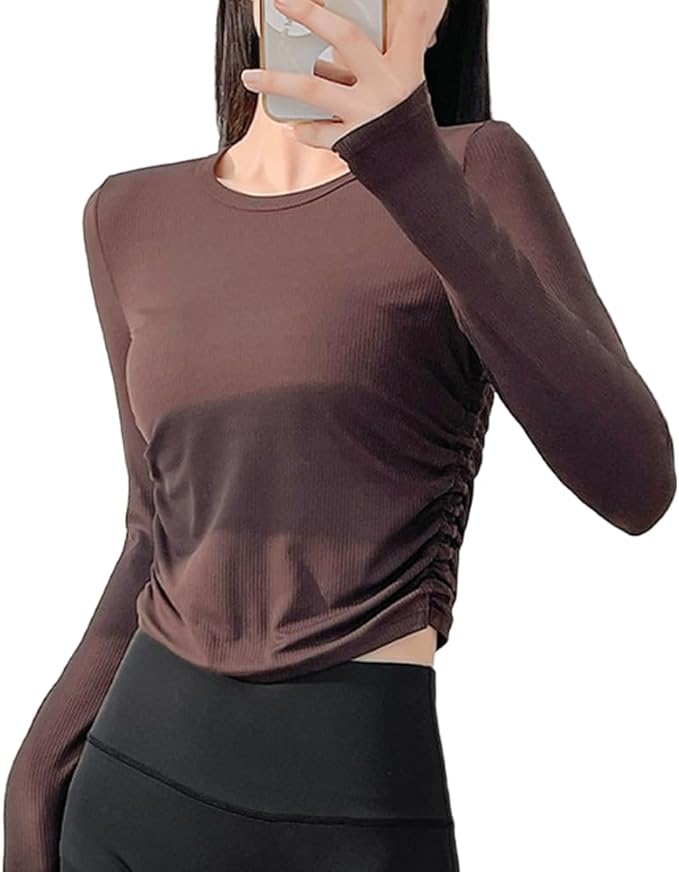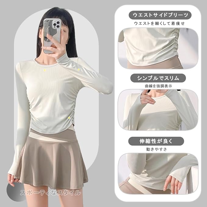 [Siomlana] ヨガウェア トップス スポーツ シャツ レディース 長袖 ピラティスウェア 部屋着 ングtシャツ レディース 丸首 スポーツウェア ジム トレーニング ストレッチ 快適 おしゃれ サイドプリーツ 春秋 通気 | funshop